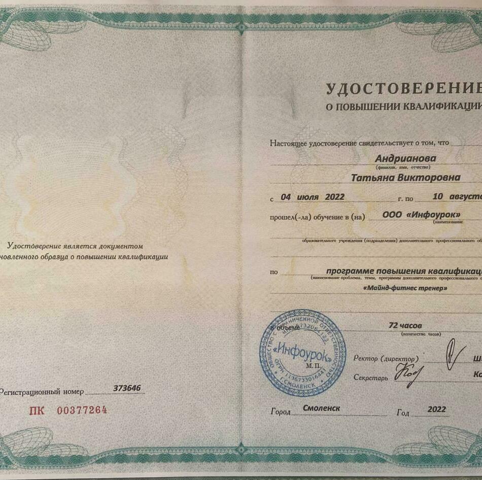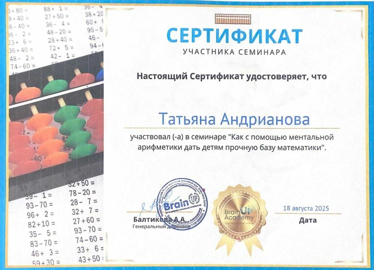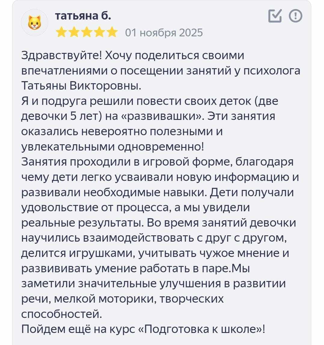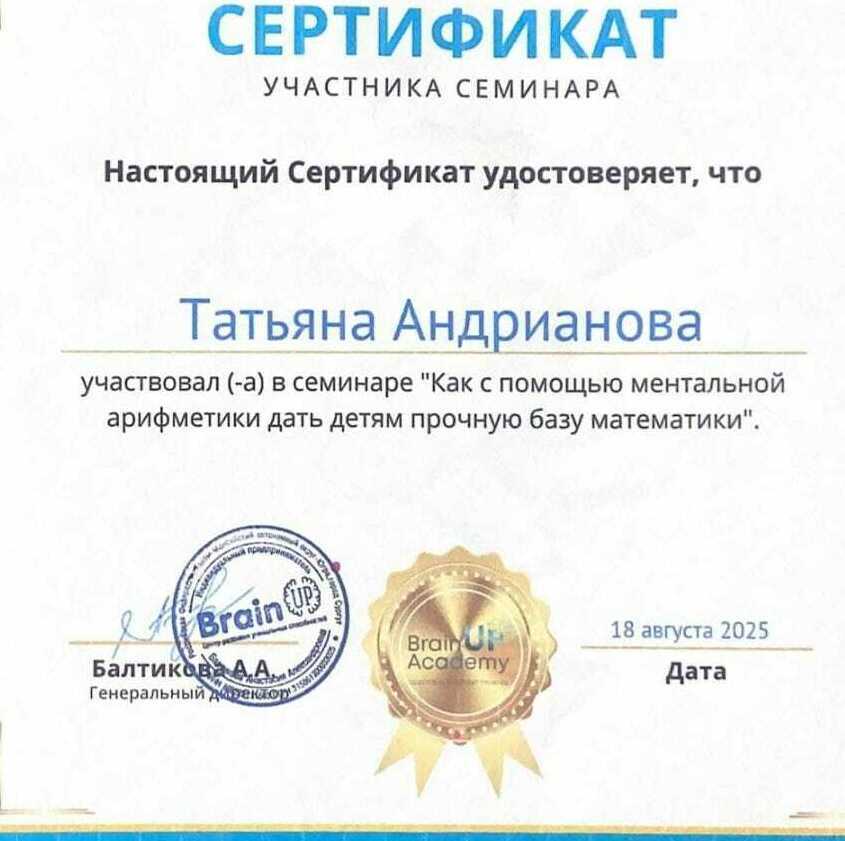 Татьяна Викторовна имеет высшее проыильное образование - МГОПУ им. Шолохова, квалификация: педагог - психолог. По первому специальному образованию - учитель начальных классов. Профессиональная переподготовка "Клиническая психология" в ФГБОУ "Государственный научный центр РФ" им. А.И. Бурназяна. Курсы в Научно - исследовательском центре детской нейропсихологии им. А.Р. Лурия: "Нейропсихологическая диагностика и коррекция в детском возрасте", "Методы и приемы телесно-ориентированной терапии в работе с детьми". Курсы повышения квалификации, НОЧУВО "Международный институт информатики, экономики и права в г. Москве" "Приемы и методы развития базовых пространственных представлений у детей с ОВЗ"; ООО "Инфоурок" "Майнд - тренер". Сертификат "Университетская библиотека" вебинар "Развитие мелкой моторики и зрительно моторной координации у детей при подготовке к школе".