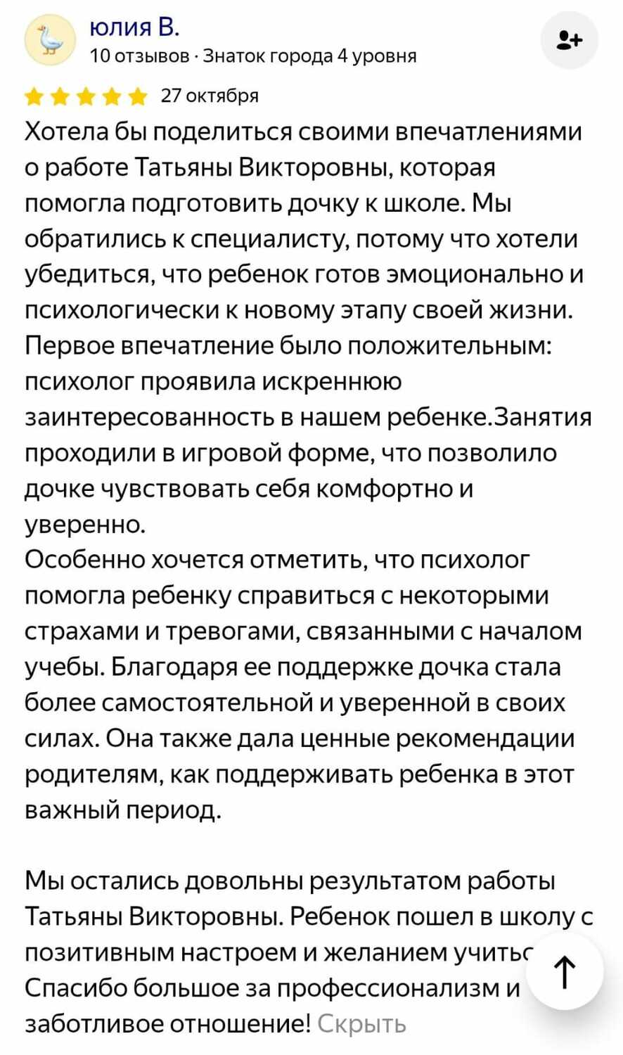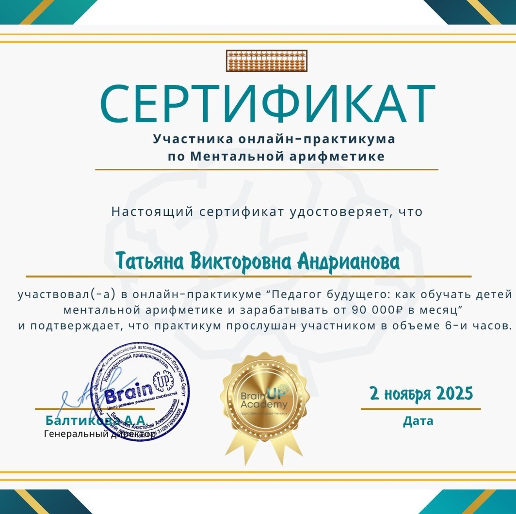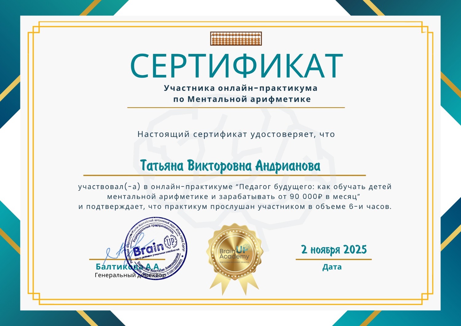 Татьяна Викторовна имеет высшее проыильное образование - МГОПУ им. Шолохова, квалификация: педагог - психолог. По первому специальному образованию - учитель начальных классов. Профессиональная переподготовка "Клиническая психология" в ФГБОУ "Государственный научный центр РФ" им. А.И. Бурназяна. Курсы в Научно - исследовательском центре детской нейропсихологии им. А.Р. Лурия: "Нейропсихологическая диагностика и коррекция в детском возрасте", "Методы и приемы телесно-ориентированной терапии в работе с детьми". Курсы повышения квалификации, НОЧУВО "Международный институт информатики, экономики и права в г. Москве" "Приемы и методы развития базовых пространственных представлений у детей с ОВЗ"; ООО "Инфоурок" "Майнд - тренер". Сертификат "Университетская библиотека" вебинар "Развитие мелкой моторики и зрительно моторной координации у детей при подготовке к школе".